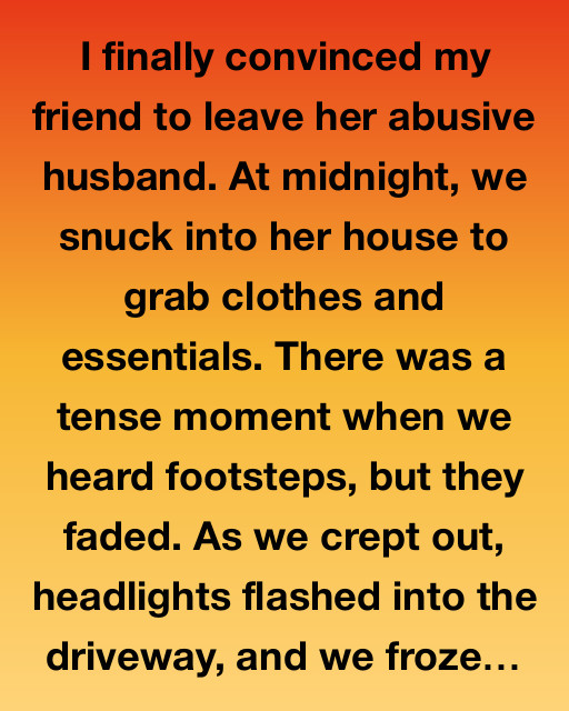 I finally convinced my friend to leave her abusive husband. At midnight, we snuck into her house to grab clothes and essentials. There was a tense moment when we heard footsteps, but they faded. As we crept out, headlights flashed into the driveway, and we froze.