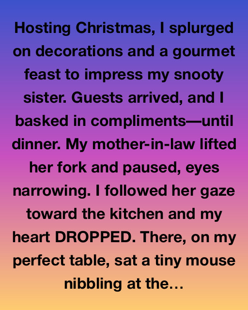Hosting Christmas, I splurged on decorations and a gourmet feast to impress my snooty sister. Guests arrived, and I basked in compliments—until dinner. My mother-in-law lifted her fork and paused, eyes narrowing. I followed her gaze toward the kitchen and my heart DROPPED. There, on my perfect table, sat a tiny mouse nibbling at the crumbs of cheese scattered beside the bread rolls.