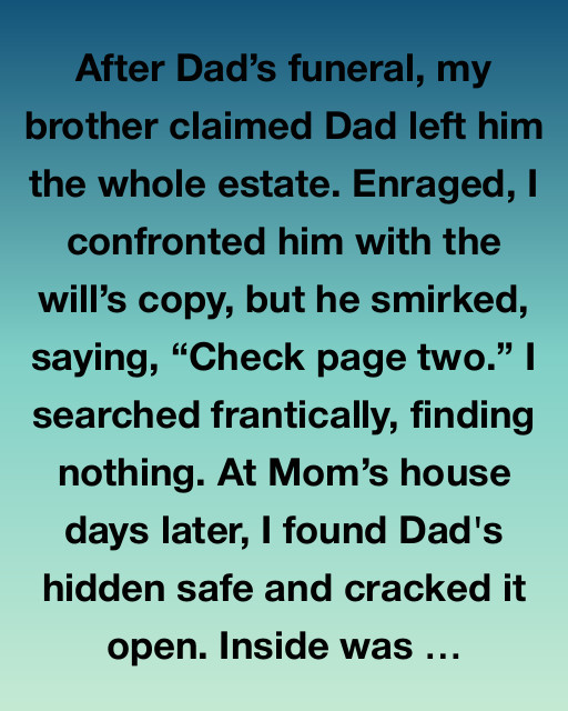 After Dadโs funeral, my brother claimed Dad left him the whole estate. Enraged, I confronted him with the willโs copy, but he smirked, saying, โCheck page two.โ I searched frantically, finding nothing. At Momโs house days later, I found Dad’s hidden safe and cracked it open. Inside was a leather-bound journal, dusty and worn, clearly held with significance.