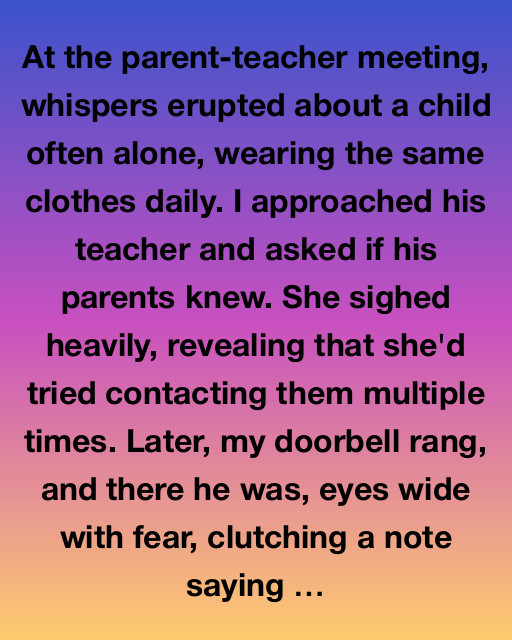 At the parent-teacher meeting, whispers erupted about a child often alone, wearing the same clothes daily. I approached his teacher and asked if his parents knew. She sighed heavily, revealing that she’d tried contacting them multiple times. Later, my doorbell rang, and there he was, eyes wide with fear, clutching a note saying that he needed help.