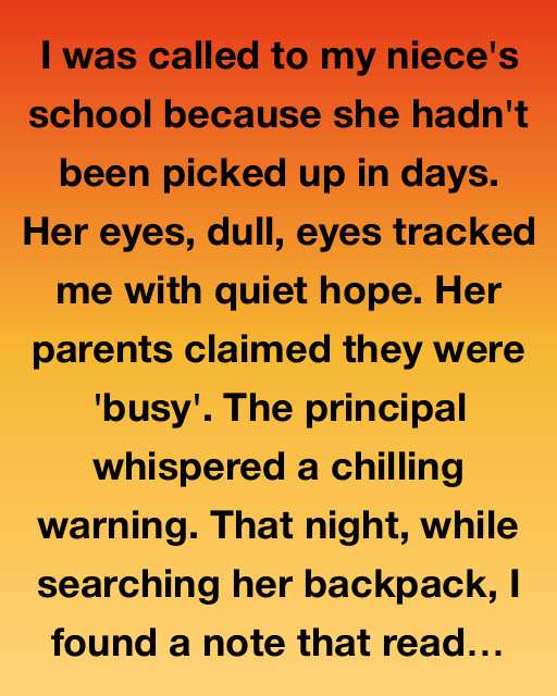 The principal, a kind woman with gentle eyes, whispered a chilling warning about her parents’ neglect. Her worry echoed through the empty school halls. That night, while searching through my niece’s backpack, I found a note that read, “Please take care of me.”