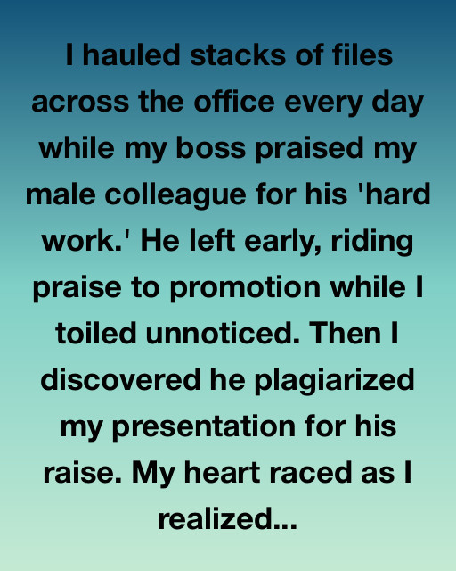 I hauled stacks of files across the office every day while my boss praised my male colleague for his ‘hard work.’ He left early, riding praise to promotion while I toiled unnoticed. Then I discovered he plagiarized my presentation for his raise. My heart raced as I realized the unfairness that unfolded before me.