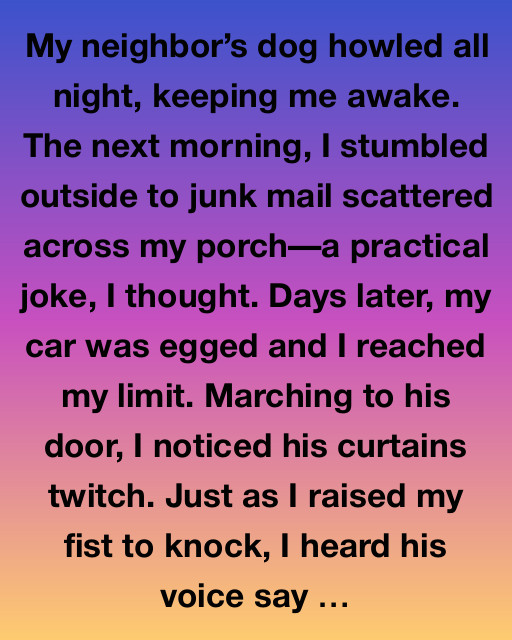 My neighborโs dog howled all night, keeping me awake. The next morning, I stumbled outside to junk mail scattered across my porchโa practical joke, I thought. Days later, my car was egged and I reached my limit. Marching to his door, I noticed his curtains twitch. Just as I raised my fist to knock, I heard his voice say, “I can’t handle this anymore!”
