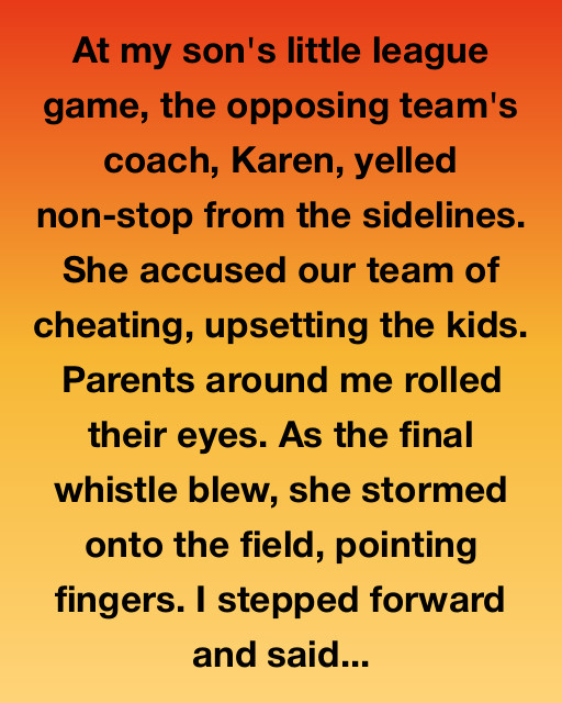 At my son’s little league game, the opposing team’s coach, Karen, yelled non-stop from the sidelines. She accused our team of cheating, upsetting the kids. Parents around me rolled their eyes. As the final whistle blew, she stormed onto the field, pointing fingers. I stepped forward and said, “Let’s take a deep breath for our children, who came to have fun.”