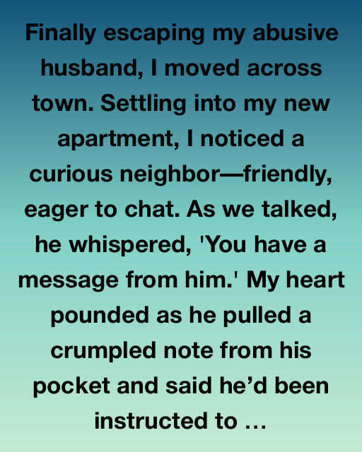 Finally escaping my abusive husband, I moved across town. Settling into my new apartment, I noticed a curious neighbor—friendly, eager to chat. As we talked, he whispered, ‘You have a message from him.’ My heart pounded as he pulled a crumpled note from his pocket and said he’d been instructed to deliver it to me.