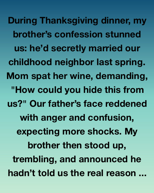 During Thanksgiving dinner, my brother’s confession stunned us: he’d secretly married our childhood neighbor last spring. Mom spat her wine, demanding, “How could you hide this from us?” Our father’s face reddened with anger and confusion, expecting more shocks. My brother then stood up, trembling, and announced he hadn’t told us the real reason.
