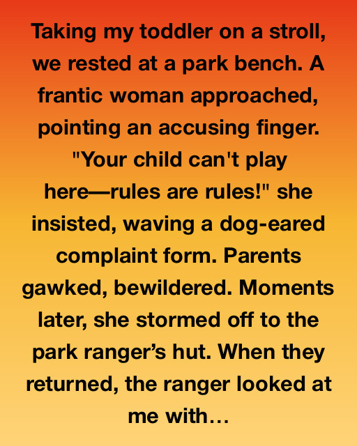 Taking my toddler on a stroll, we rested at a park bench. A frantic woman approached, pointing an accusing finger. “Your child can’t play here—rules are rules!” she insisted, waving a dog-eared complaint form. Parents gawked, bewildered. Moments later, she stormed off to the park ranger’s hut. When they returned, the ranger looked at me with curiosity rather than condemnation.