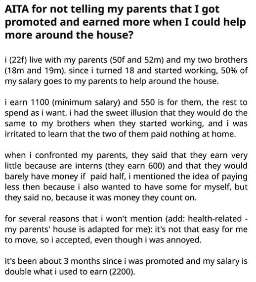 AITA For Not Telling My Parents That I Got Promoted And Earned More When I Could Help More Around The House?