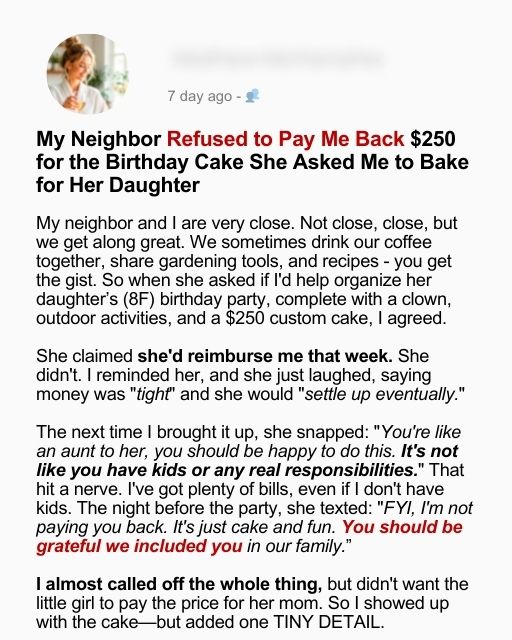 My Neighbor Refused to Pay Me Back $250 for the Birthday Cake She Asked Me to Bake for Her Daughter