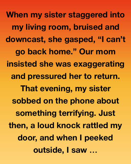When my sister staggered into my living room, bruised and downcast, she gasped, โI canโt go back home.โ Our mom insisted she was exaggerating and pressured her to return. That evening, my sister sobbed on the phone about something terrifying. Just then, a loud knock rattled my door, and when I peeked outside, I saw a figure silhouetted against the streetlight.