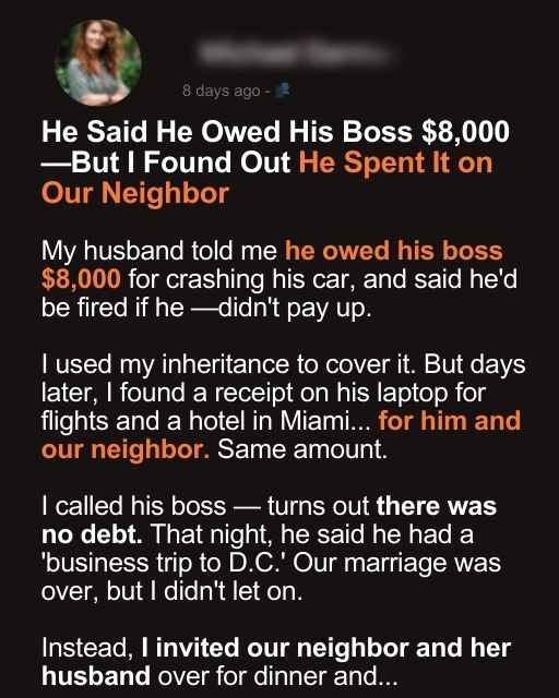 My husband told me he owed his boss $8,000 for crashing his car and said he’d be fired if he didn’t pay up. I used my inheritance to cover it. But days later, I found a receipt on his laptop for flights and a hotel in Miami… for him and our neighbor. Same amount. I called his boss — turns out there was no debt. That night, he said he had a ‘business trip to D.C.’ Our marriage was over, but I didn’t let on. Instead, I invited our neighbor and her husband over for dinner and waited.