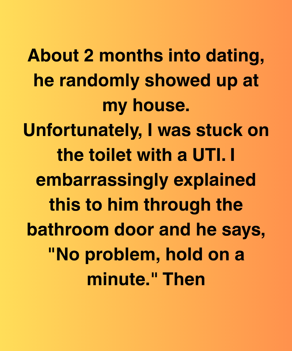 Unfortunately, I was stuck on the toilet with a UTI. I embarrassingly explained this to him through the bathroom door and he says, “No problem, hold on a minute.” Then he disappeared.