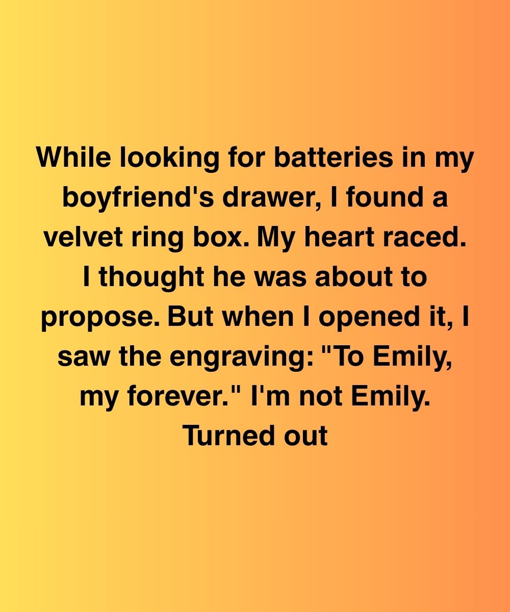 I thought he was about to propose. But when I opened it, I saw the engraving: “To Emily, my forever.” I’m not Emily.
