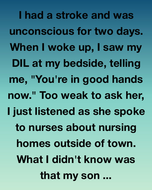 I had a stroke and was unconscious for two days. When I woke up, I saw my DIL at my bedside, telling me, “You’re in good hands now.” Too weak to ask her, I just listened as she spoke to nurses about nursing homes outside of town.