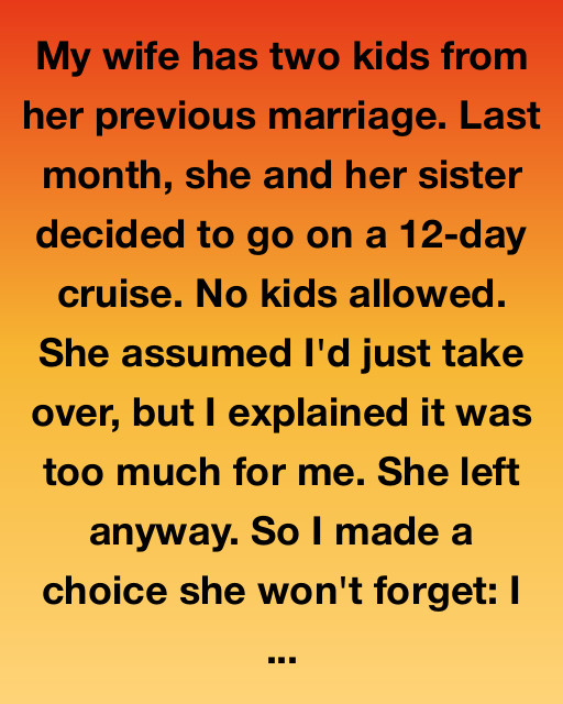 My wife has two kids from her previous marriage. Last month, she and her sister decided to go on a 12-day cruise. No kids allowed. She assumed I’d just take over, but I explained it was too much for me. She left anyway. So I made a choice she wonโt forget: I packed my things, called my brother, and moved out.