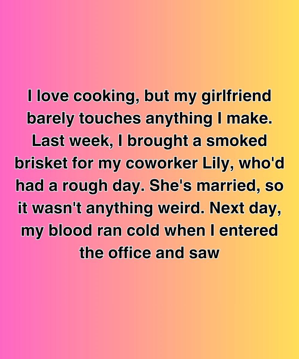 Last week, I brought a smoked brisket for my coworker Lily, who’d had a rough day. She’s married, so it wasn’t anything weird.