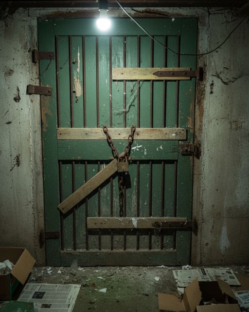 Green slats, thick wood, iron brackets drilled right into the concrete. Padlocked. Bolted. And dead silent on the other side. There were old newspapers on the floor like someone had tried to bury it under junk, but the dust on the hinges? Recently disturbed.