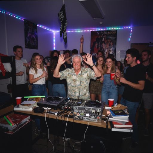 Hawaiian shirt, big grin, carrying a crate under his arm. Nobody invited him—he just appeared. Before I could say anything, he marched straight to the DJ table, nudged my roommate aside, and started fiddling with the turntables like he’d been doing it his whole life.