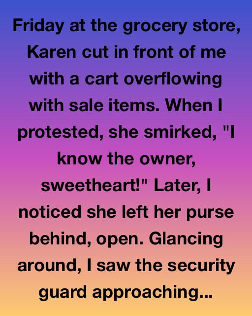 Friday at the grocery store, Karen cut in front of me with a cart overflowing with sale items. When I protested, she smirked, “I know the owner, sweetheart!” Later, I noticed she left her purse behind, open. Glancing around, I saw the security guard approaching, his pace quick and his expression astute. I picked up Karen’s purse, instinctively deciding to hand it to him, since I didn’t want to be accused of anything through misunderstanding.