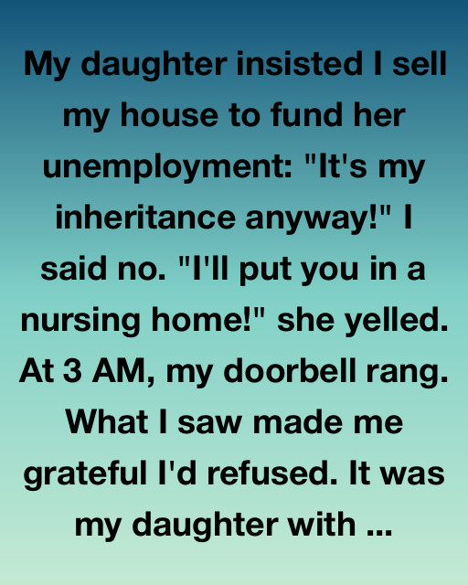 My daughter insisted I sell my house to fund her unemployment: “It’s my inheritance anyway!” I said no. “I’ll put you in a nursing home!” she yelled. At 3 AM, my doorbell rang. What I saw made me grateful I’d refused. It was my daughter with blood on her lip, mascara smeared, and her shoes in her hands like she’d been running barefoot.