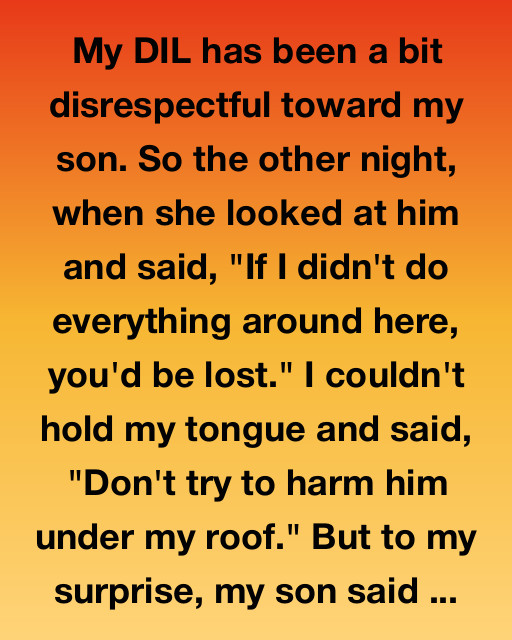 My DIL has been a bit disrespectful toward my son. So the other night, when she looked at him and said, “If I didn’t do everything around here, you’d be lost.” I couldn’t hold my tongue and said, “Don’t try to harm him under my roof.” But to my surprise, my son said, “Mom, please don’t. She’s just tired. I’ll handle it later.”