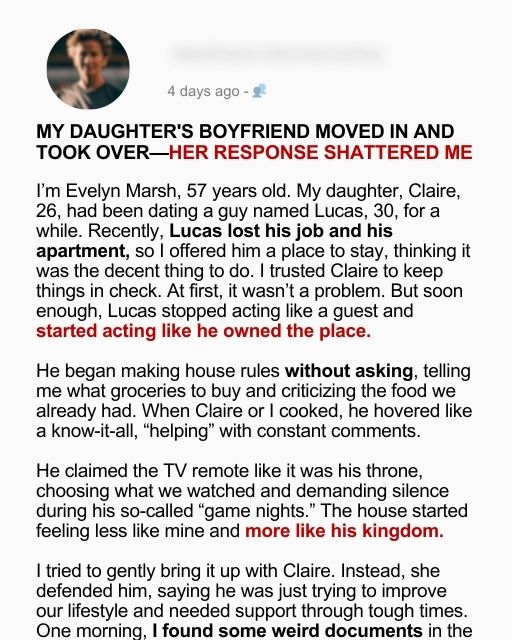 At 57, I’ve learned a few things about life and people. One of those things is that kindness isn’t always enough. Sometimes, it can be taken for granted or worse—used against you. I learned this the hard way when my daughter Claire’s boyfriend, Lucas, moved into our home and slowly, insidiously, took it over.