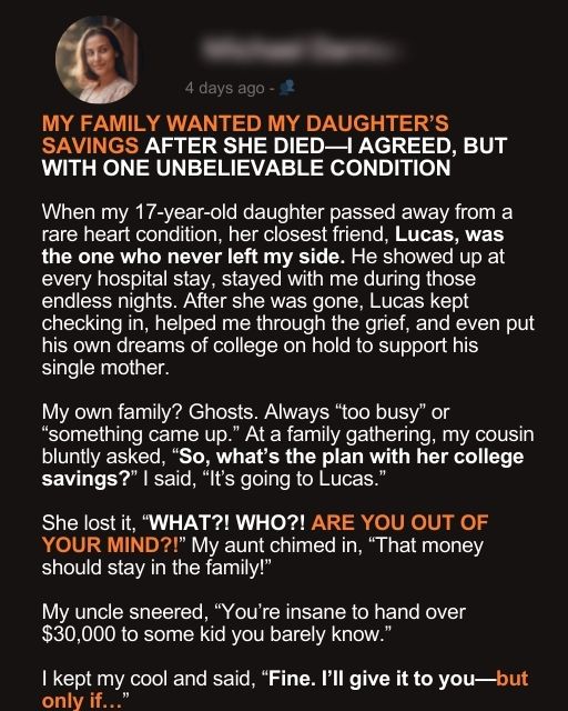 When my 17-year-old daughter passed away from a rare heart condition, her closest friend Lucas was the one who never left my side. He showed up at every hospital stay, stayed with me during those endless nights. After she was gone, Lucas kept checking in, helped me through the grief, and even put his own dreams of college on hold to support his single mother.