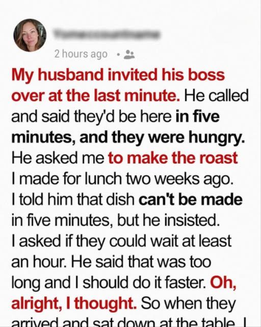 My husband invited his boss over at the last minute. He called and said they’d be here in five minutes, and they were hungry. He asked me to make the roast I made for lunch two weeks ago. I told him that dish can’t be made in five minutes, but he insisted. I asked if they could wait at least an hour. He said that was too long and I should do it faster. Oh, alright, I thought. So when they arrived and sat down at the table, I was frantically trying to figure out how to make everything work. I had no idea what I was going to do.