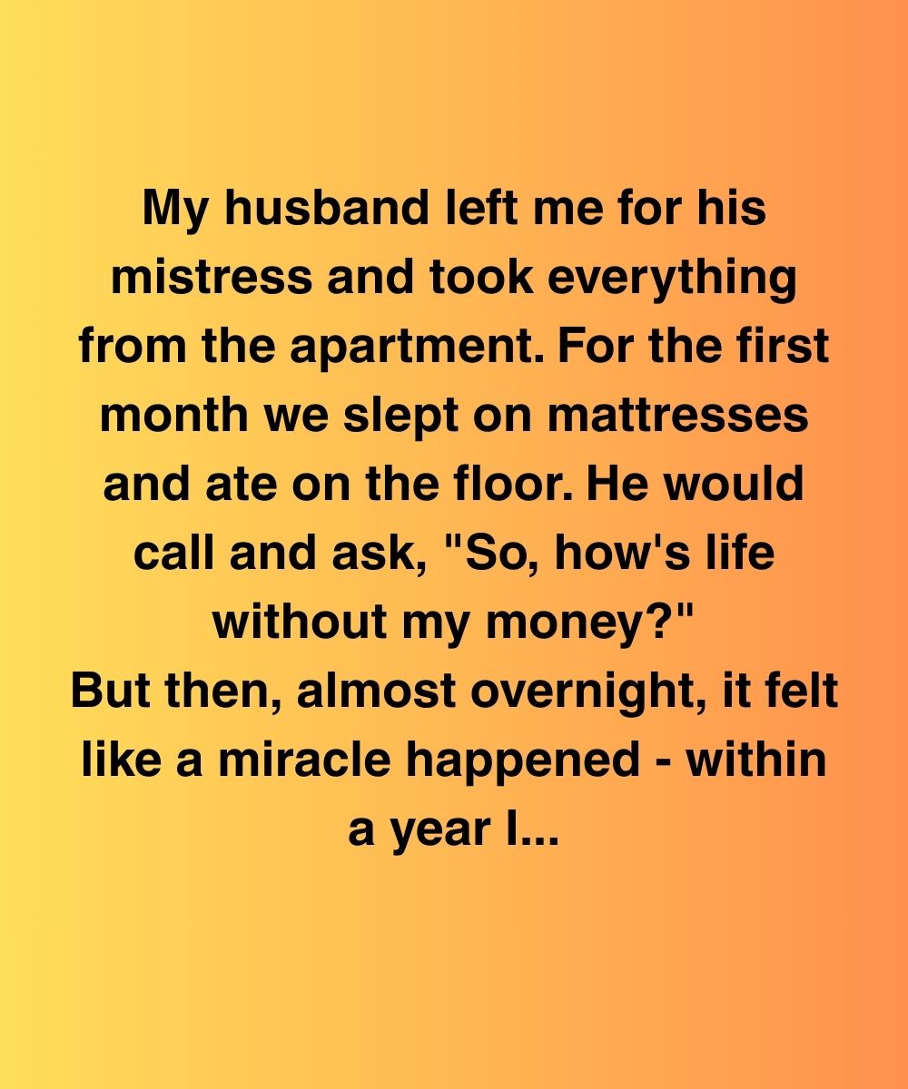 My husband left me for his mistress and took everything from the apartment. For the first month we slept on mattresses and ate on the floor. He would call and ask, “So, how’s life without my money?”