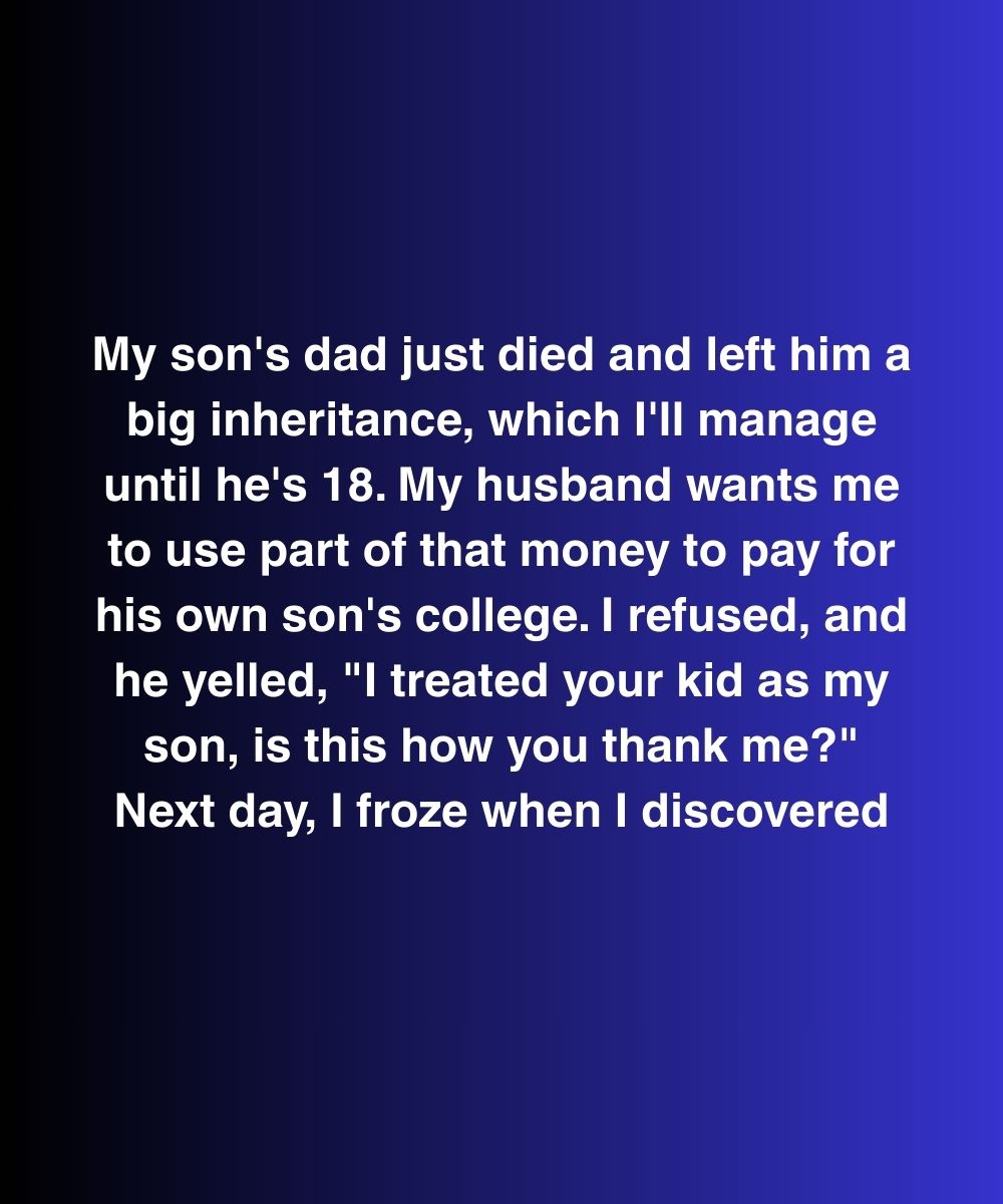 My son’s dad just died and left him a big inheritance, which I’ll manage until he’s 18. My husband wants me to use part of that money to pay for his own son’s college. I refused, and he yelled, “I treated your kid as my son, is this how you thank me?”