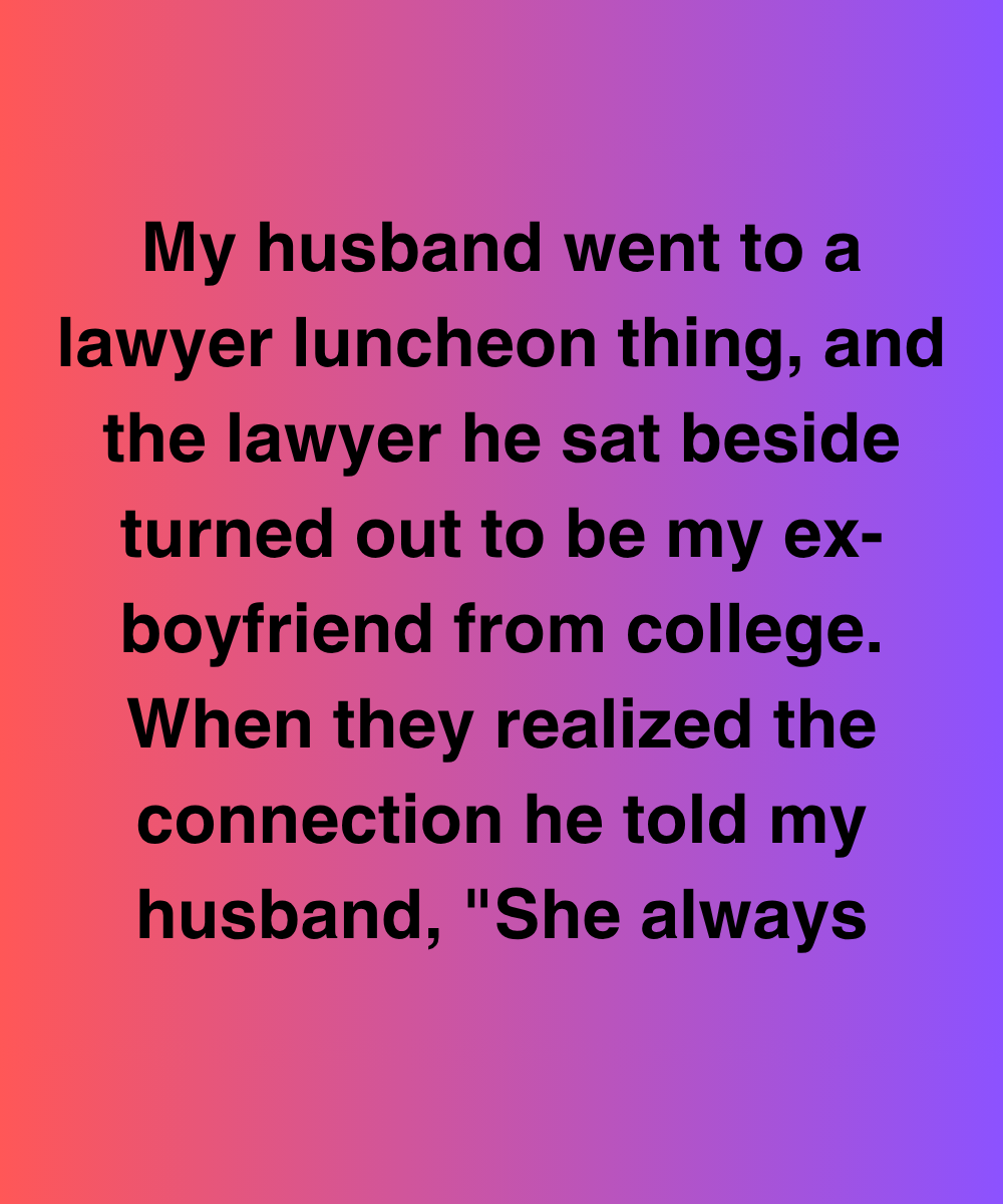 My husband went to a lawyer luncheon thing, and the lawyer he sat beside turned out to be my ex-boyfriend from college. When they realized the connection he told my husband, “She always had this way of making everyone feel like they mattered.” That’s what my husband told me later, with a small smile that made me pause.