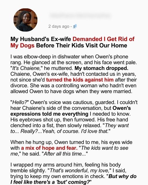 I froze, feeling a sharp pang in my chest. My two Labradors, Max and Bella, were more than pets—they were family. They had been with us through late-night moves, layoffs, and even Owen’s rough patch after the divorce. Telling me to get rid of them felt like telling me to erase part of our life.