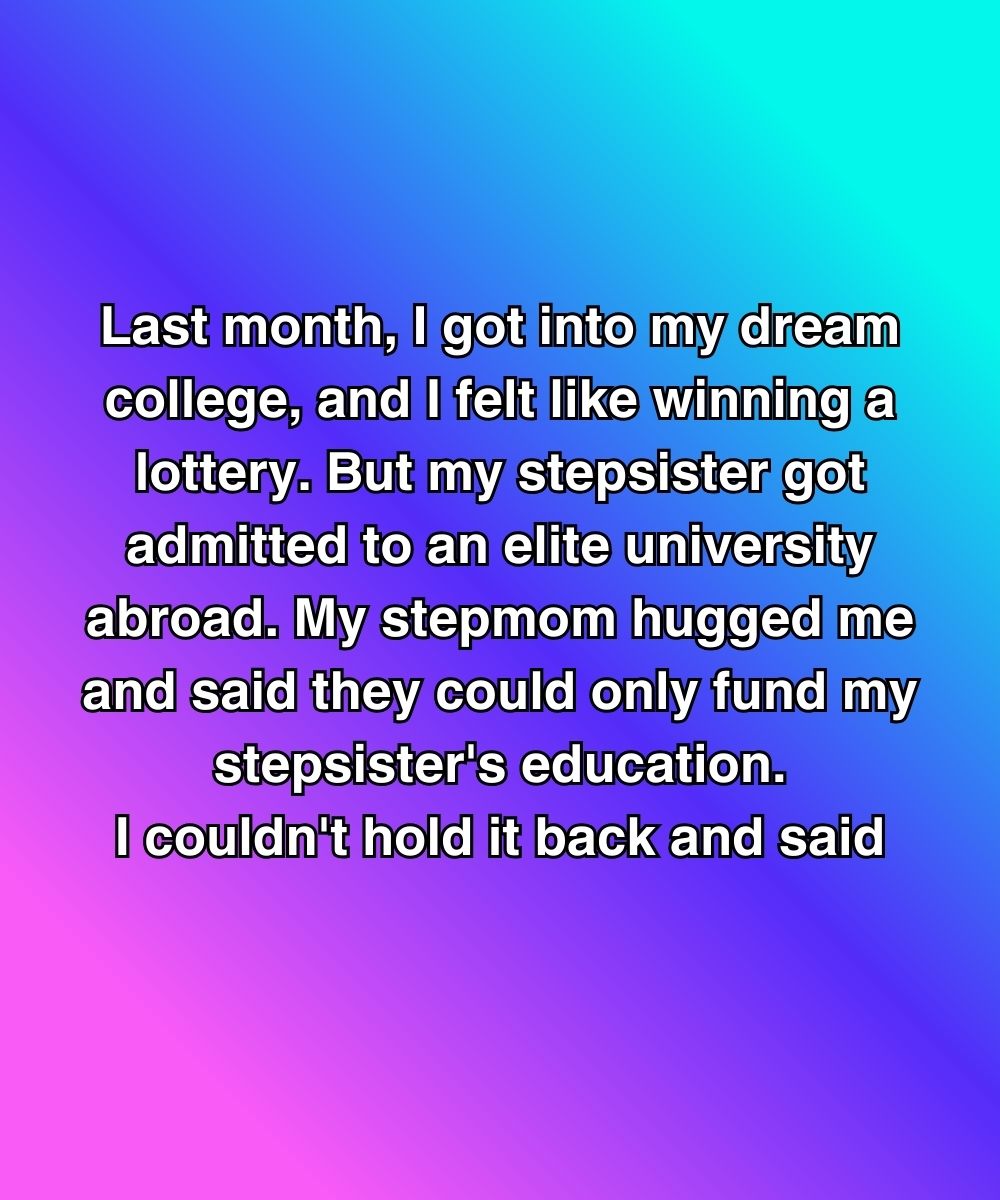 Last month, I got into my dream college, and I felt like winning a lottery. But my stepsister got admitted to an elite university abroad. My stepmom hugged me and said they could only fund my stepsister’s education.