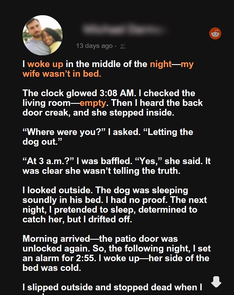 Morning arrived—the patio door was unlocked again. So, the following night, I set an alarm for 2:55. I woke up—her side of the bed was cold.