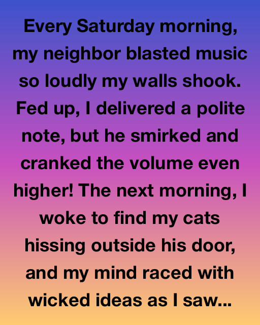 Every Saturday morning, my neighbor blasted music so loudly my walls shook. Fed up, I delivered a polite note, but he smirked and cranked the volume even higher! The next morning, I woke to find my cats hissing outside his door, and my mind raced with wicked ideas as I saw the potted plant toppled over.