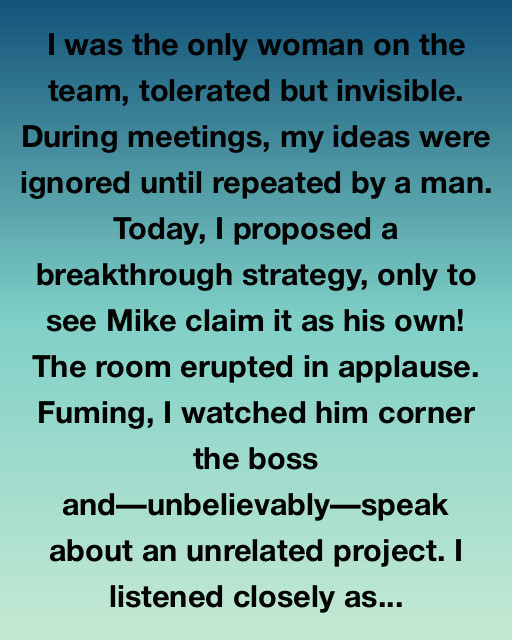 I was the only woman on the team, tolerated but invisible. During meetings, my ideas were ignored until repeated by a man. Today, I proposed a breakthrough strategy, only to see Mike claim it as his own! The room erupted in applause. Fuming, I watched him corner the boss and—unbelievably—speak about an unrelated project. I listened closely as John, our boss, nodded in agreement to Mike’s diversionary tactics that were as shallow as a dry creek – purely for show, no substance.