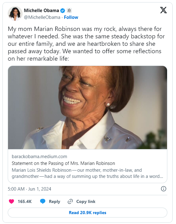 Michelle Obama conveyed her deep emotions on X, stating, โ€œMy mom Marian Robinson was my rock, always there for whatever I needed. She was the same steady backstop for our entire family, and we are heartbroken to share she passed away today.โ€