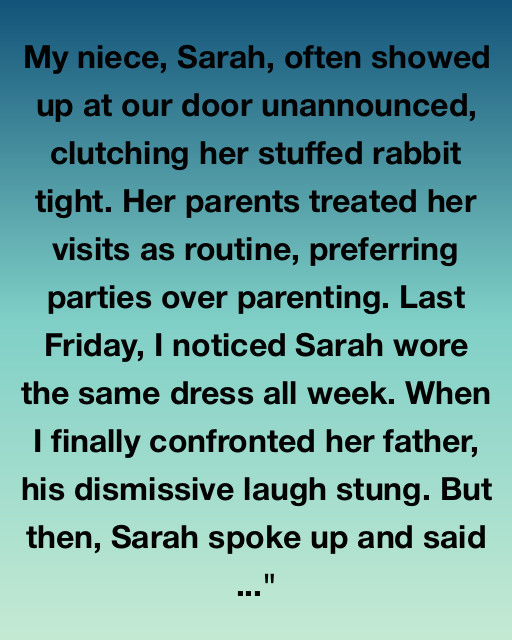 My niece, Sarah, often showed up at our door unannounced, clutching her stuffed rabbit tight. Her parents treated her visits as routine, preferring parties over parenting. Last Friday, I noticed Sarah wore the same dress all week. When I finally confronted her father, his dismissive laugh stung. But then, Sarah spoke up and said, “It’s my favorite dress because it makes me feel safe and loved. You and Auntie make me feel safe.”
