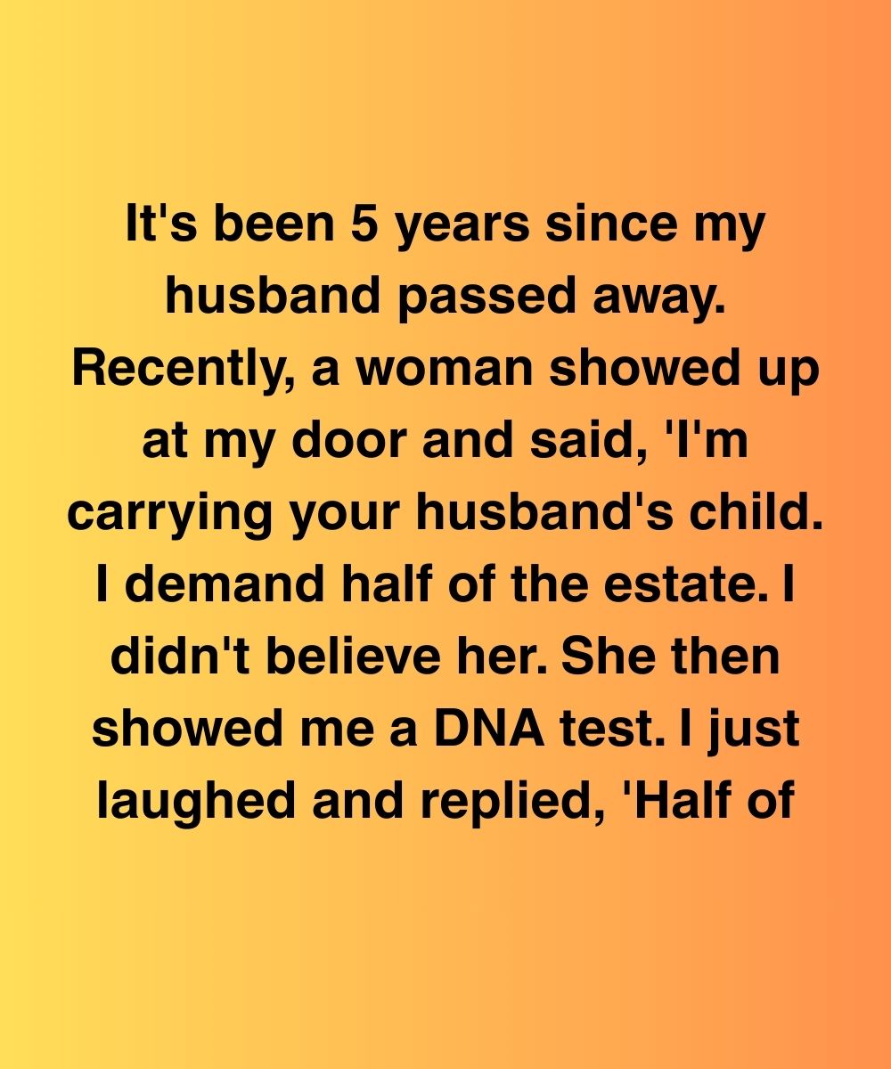 It’s been 5 years since my husband passed away. Recently, a woman showed up at my door and said, “I’m carrying your husband’s child. I demand half of the estate.” I didn’t believe her. She then showed me a DNA test. I just laughed and replied, “Half of what? The man left me with debt and a half-finished patio.”
