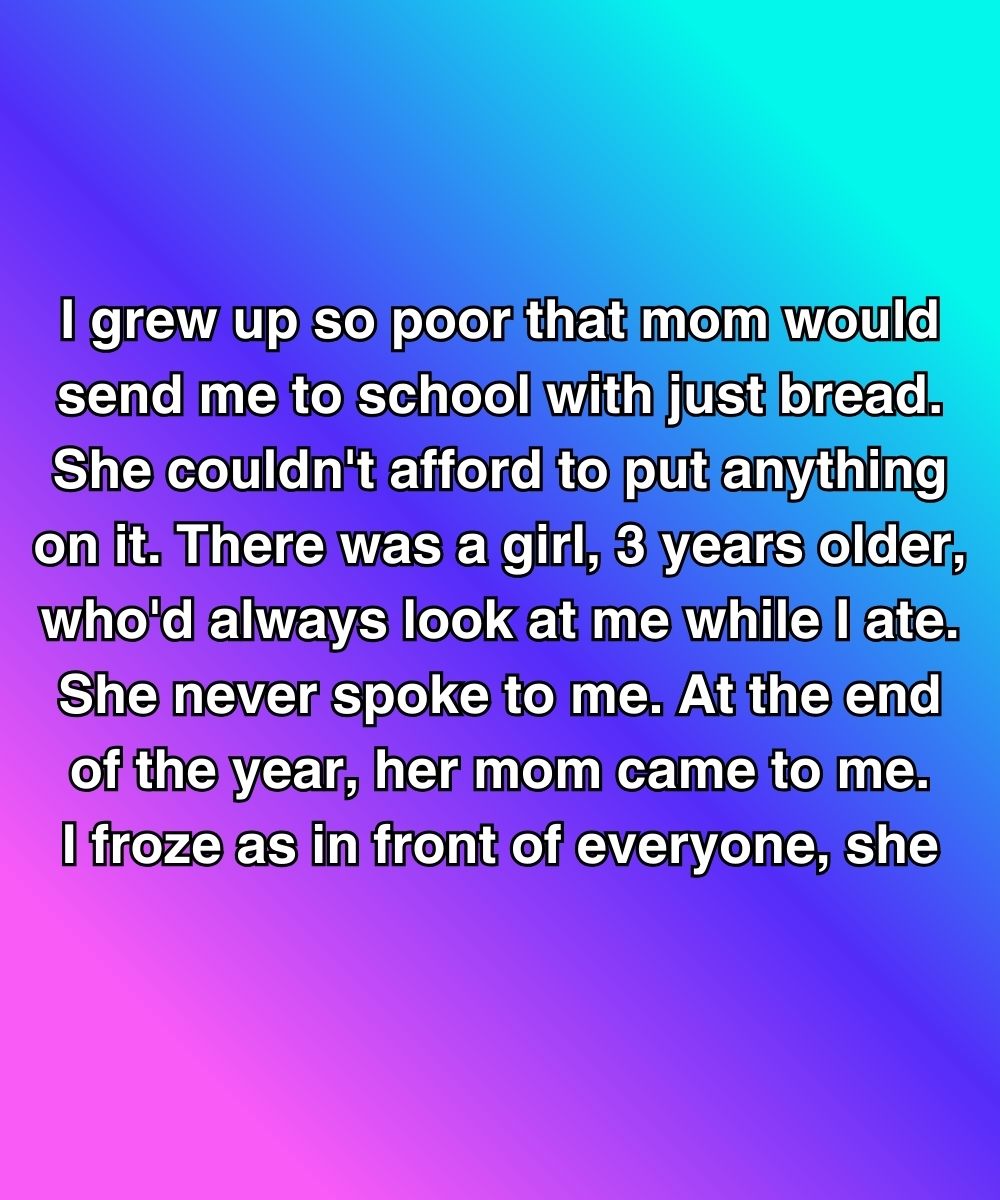 I grew up so poor that Mom would send me to school with just bread. She couldn’t afford to put anything on it. There was a girl, three years older, who’d always look at me while I ate.