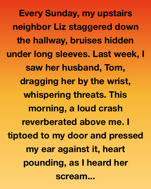 Every Sunday, my upstairs neighbor Liz staggered down the hallway, bruises hidden under long sleeves. Last week, I saw her husband, Tom, dragging her by the wrist, whispering threats. This morning, a loud crash reverberated above me. I tiptoed to my door and pressed my ear against it, heart pounding, as I heard her scream.