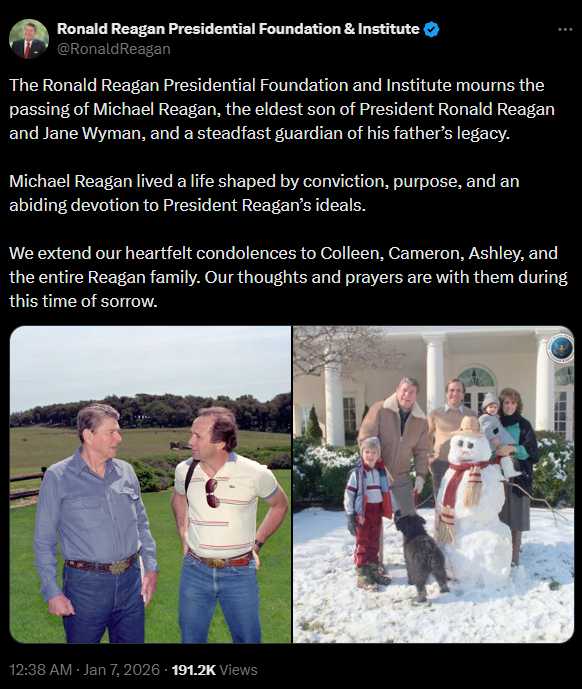 โ€œMichael Reagan lived a life shaped by conviction, purpose, and an abiding devotion to President Reaganโ€™s ideals,โ€ Fred Ryan, chairman of the foundationโ€™s board said. โ€œA successful author, nationally syndicated radio talk show host, and sought-after public speaker, Michael used his voice to champion freedom, personal responsibility, and the principles that defined his fatherโ€™s presidency.โ€