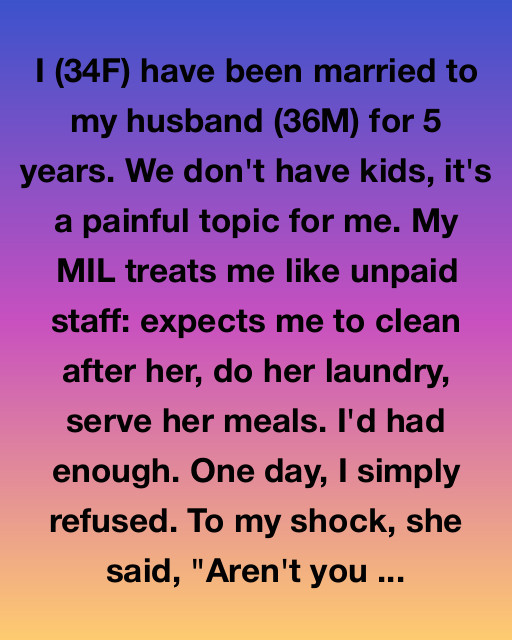 I (34F) have been married to my husband (36M) for 5 years. We don’t have kids, it’s a painful topic for me. My MIL treats me like unpaid staff: expects me to clean after her, do her laundry, serve her meals. I’d had enough. One day, I simply refused. To my shock, she said, “Aren’t you supposed to earn your place in this family?”