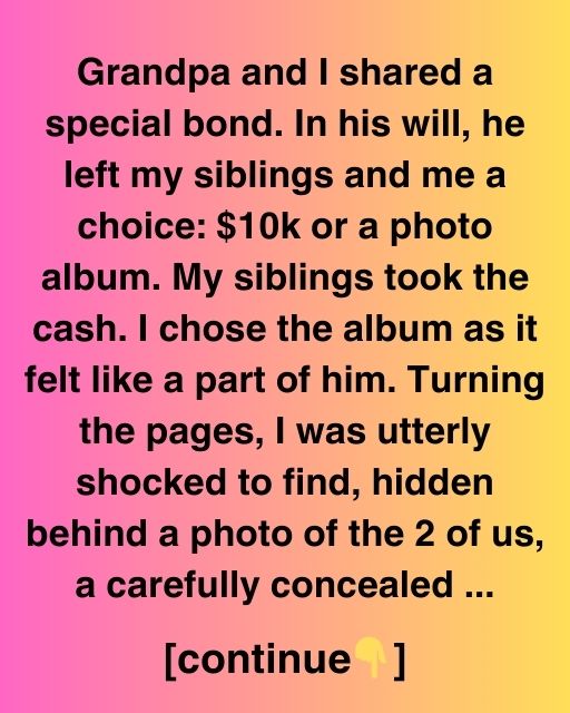Grandpa and I shared a special bond. In his will, he left my siblings and me a choice: $10k or a photo album. My siblings took the cash. I chose the album as it felt like a part of him. Turning the pages, I was utterly shocked to find, hidden behind a photo of the two of us, a carefully concealed envelope.