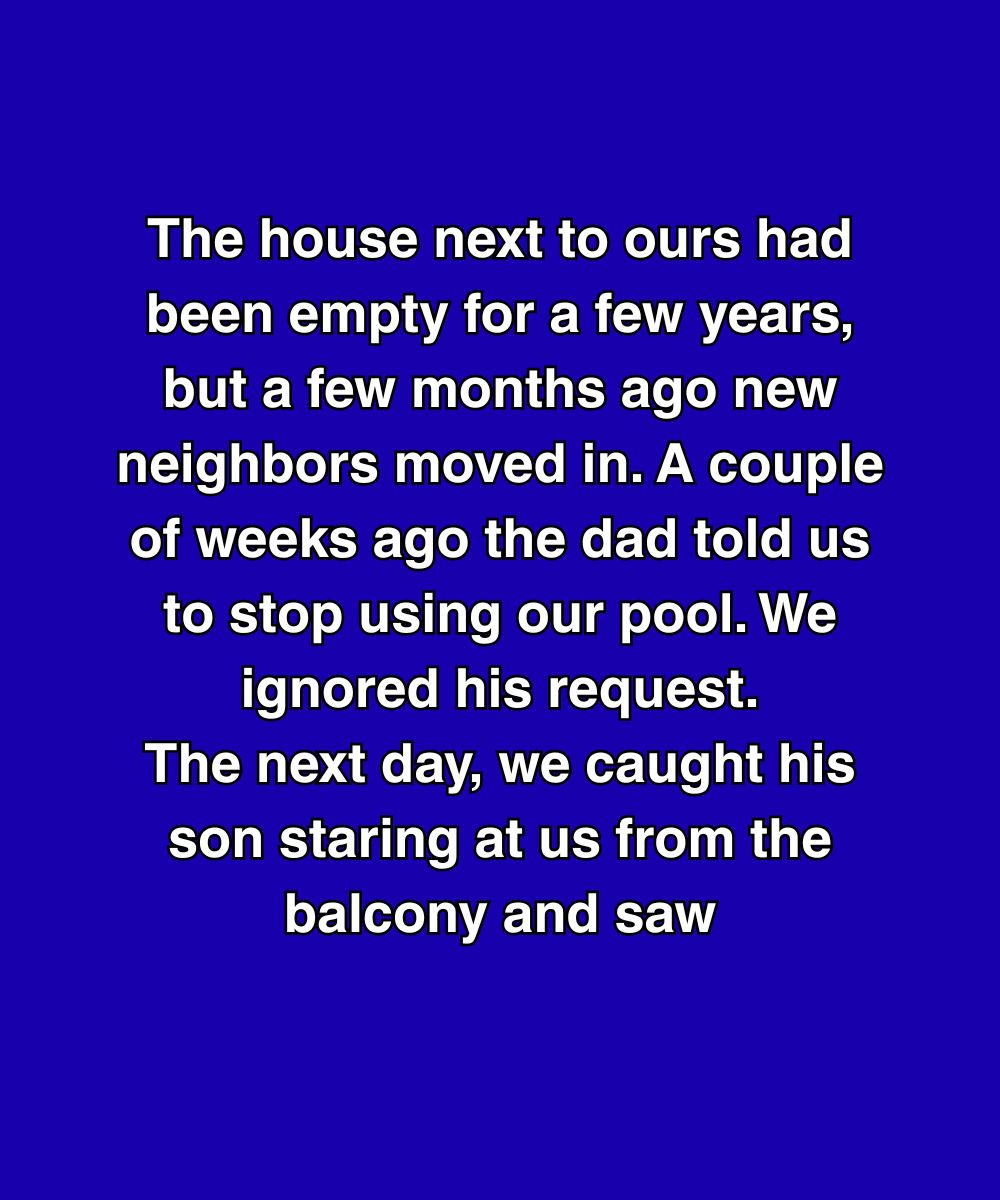 The house next to ours had been empty for a few years, but a few months ago new neighbors moved in. A couple of weeks ago the dad told us to stop using our pool. We ignored his request.