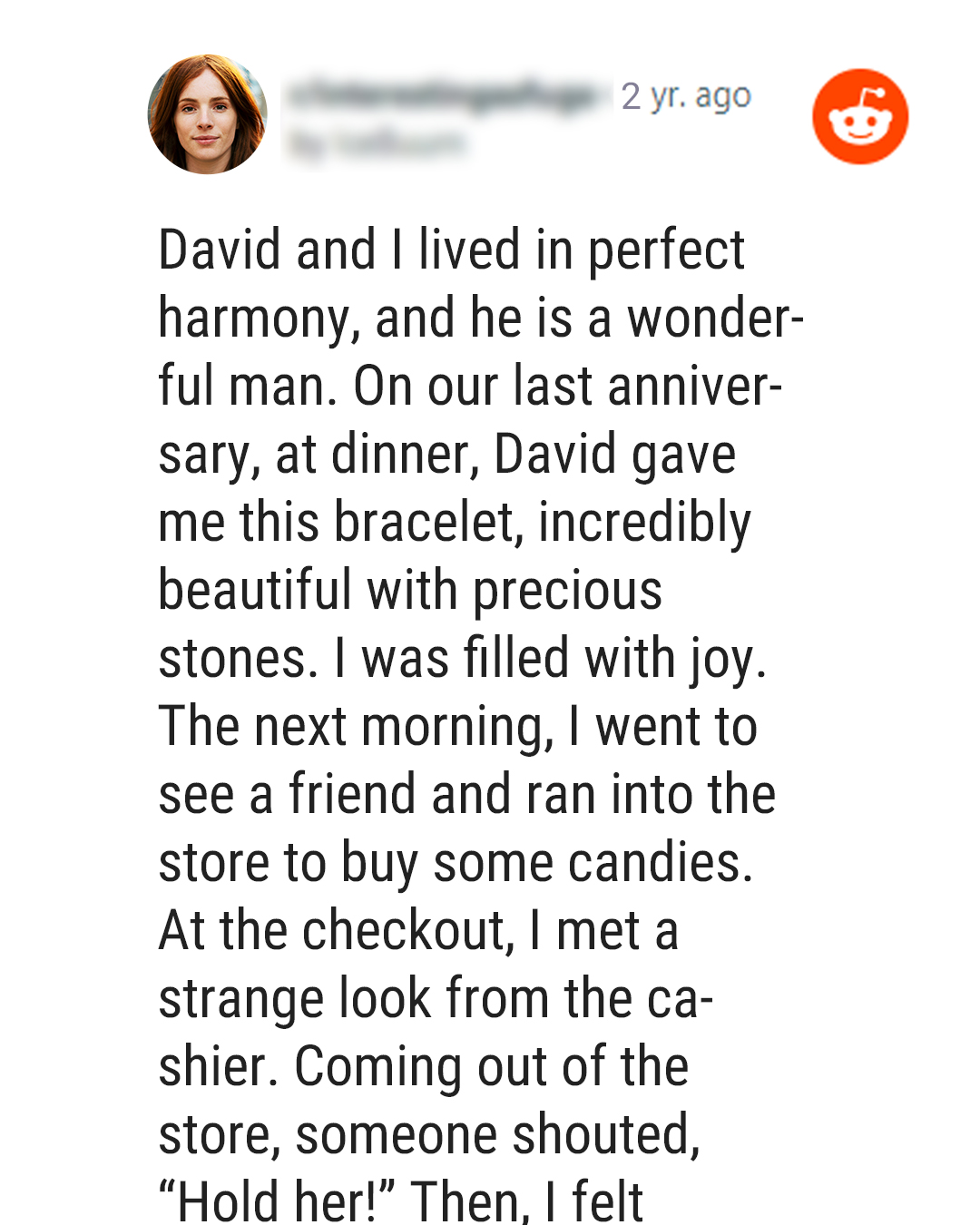 David and I lived in perfect harmony, and he is a wonderful man. On our last anniversary, at dinner, David gave me this bracelet, incredibly beautiful with precious stones. I was filled with joy. The next morning, I went to see a friend and ran into the store to buy some candies.