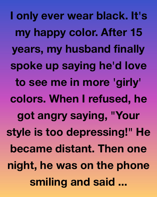 I only ever wear black. It’s my happy color. After 15 years, my husband finally spoke up saying he’d love to see me in more ‘girly’ colors. When I refused, he got angry saying, ‘Your style is too depressing!’ He became distant. Then one night, he was on the phone smiling and said ‘I’ll tell her soon. She won’t even see it coming.’