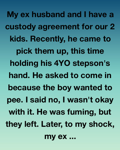 My ex-husband and I have a custody agreement for our two kids. Recently, he came to pick them up, this time holding his 4-year-old stepson’s hand. He asked to come in because the boy wanted to pee. I said no, I wasn’t okay with it. He was fuming, but they left.