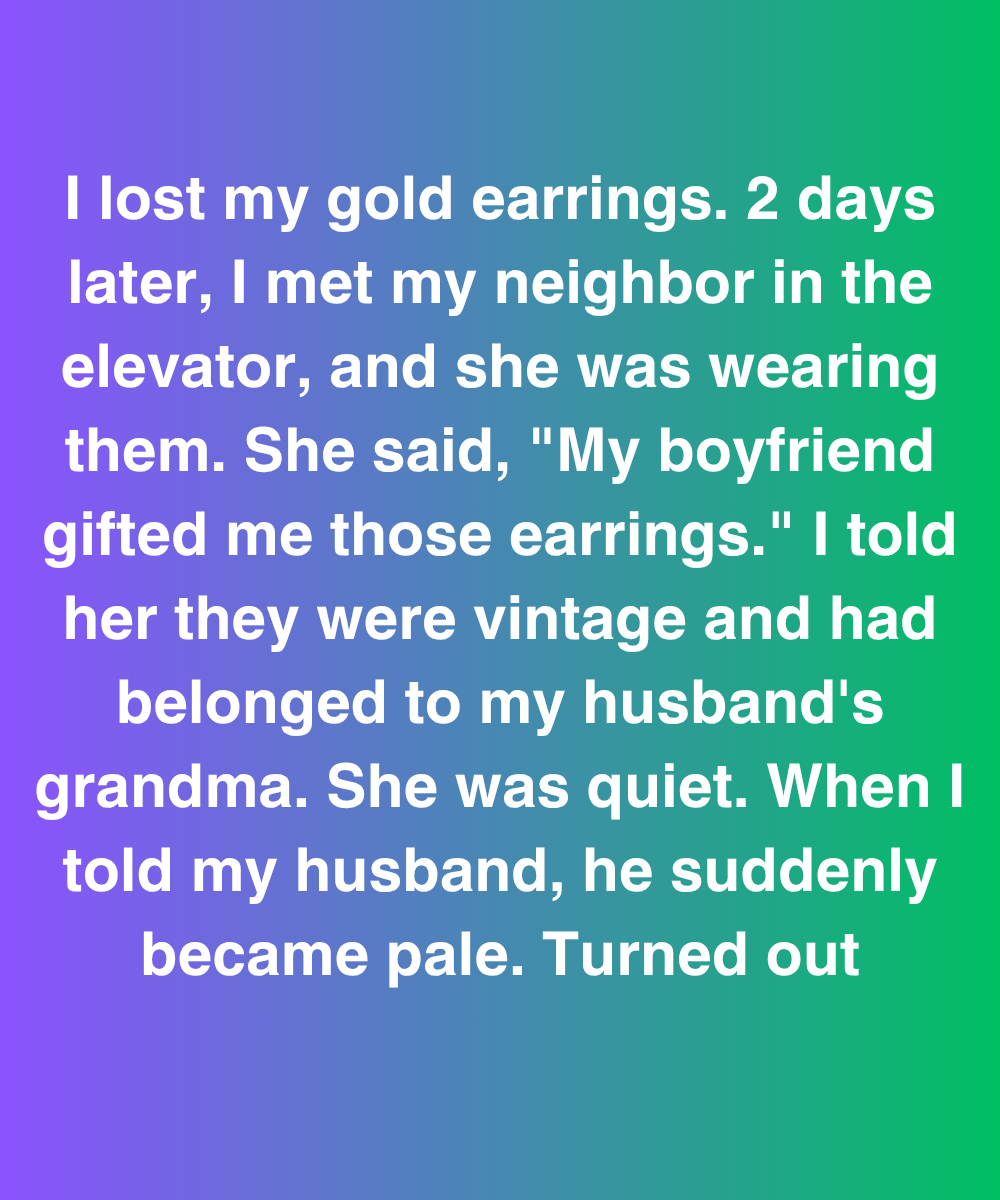 I lost my gold earrings. Two days later, I met my neighbor in the elevator, and she was wearing them. She said, “My boyfriend gifted me those earrings.” I told her they were vintage and had belonged to my husband’s grandma. She was quiet. When I told my husband, he suddenly became pale. Turned out he knew exactly which earrings I meant, and his expression told me there was more to the story than he wanted to say.