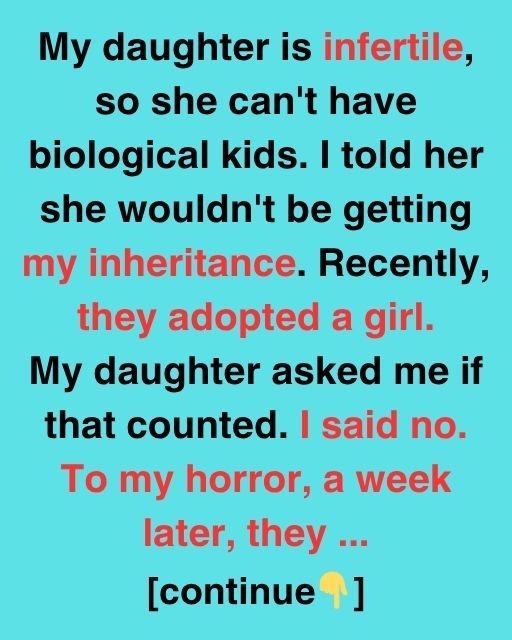 My daughter is infertile, so she can’t have biological kids. I told her she wouldn’t be getting my inheritance. Recently, they adopted a girl. My daughter asked me if that counted. I said no. To my horror, a week later, they stopped talking to me.